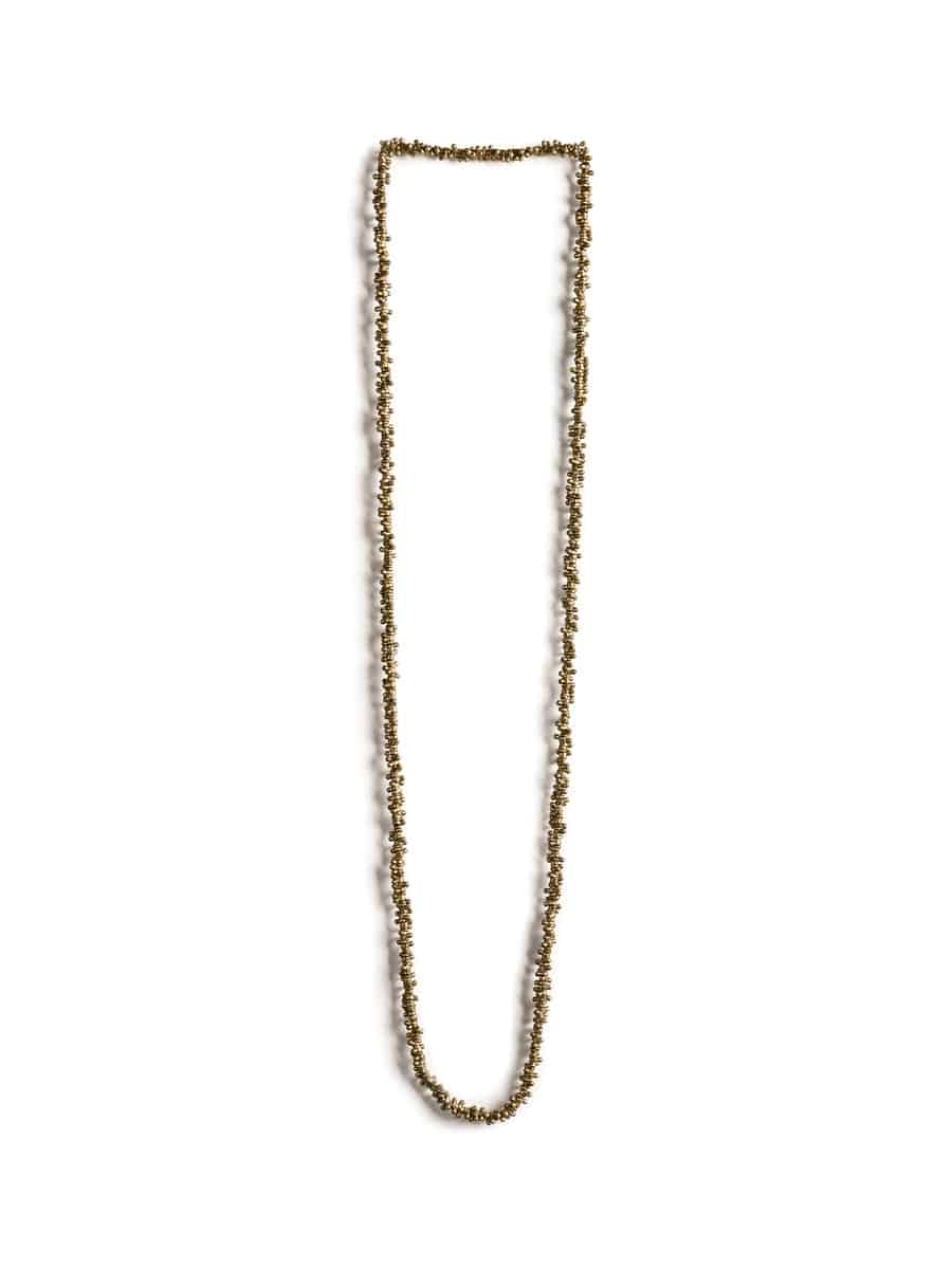 שרשרת שבטית עשויה חרוזי פליז, מושחלים בעבודת יד של מעצבת התכשיטים אילן אורבך.