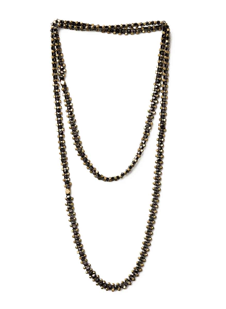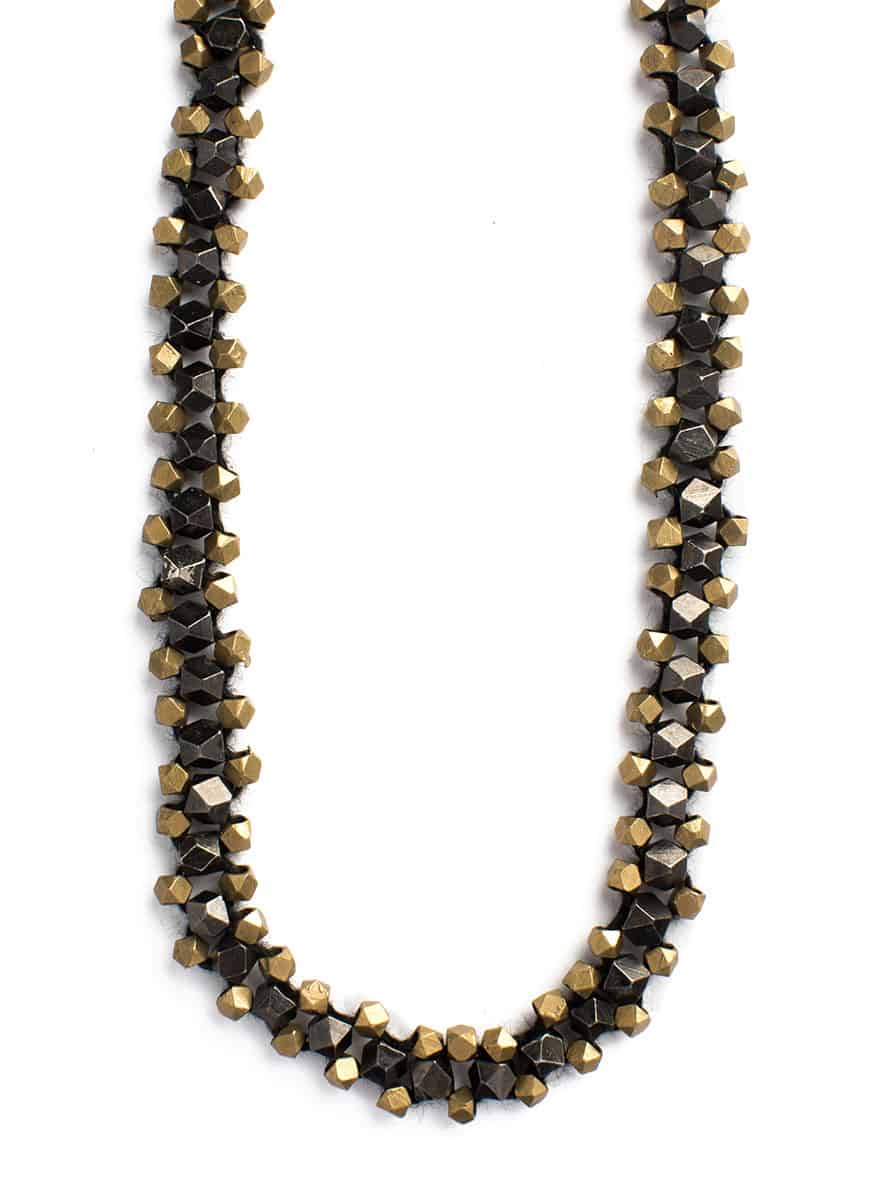 שרשרת שבטית עשויה חרוזי פליז מצופה זהב, מושחלים בעבודת יד של מעצבת התכשיטים אילן אורבך.