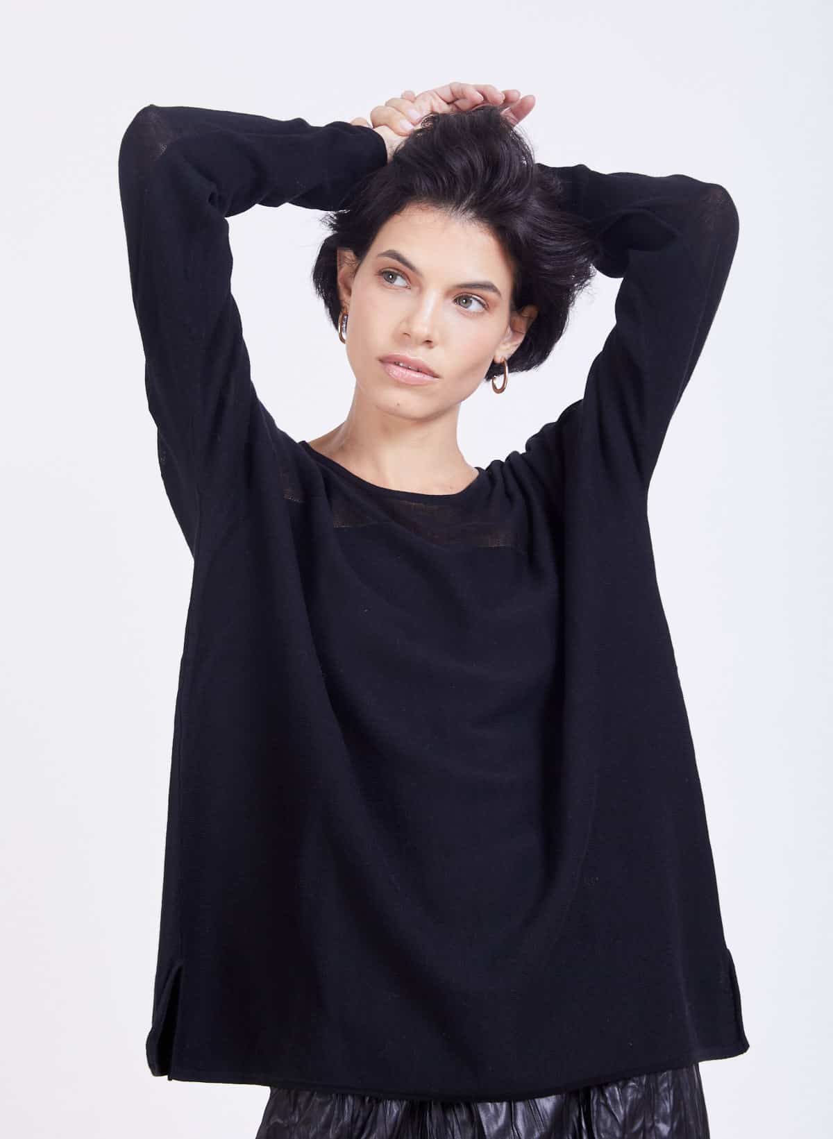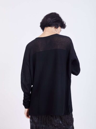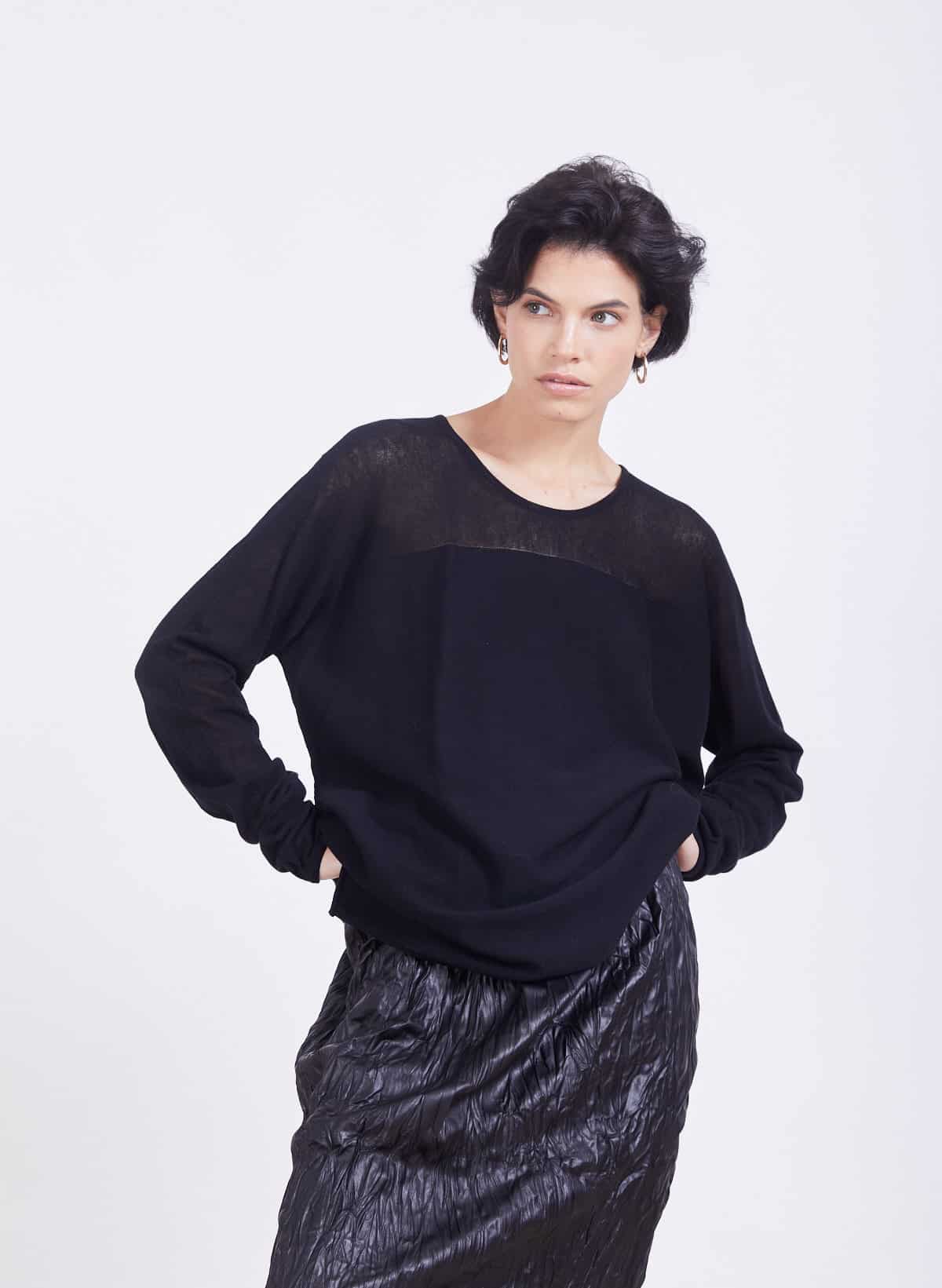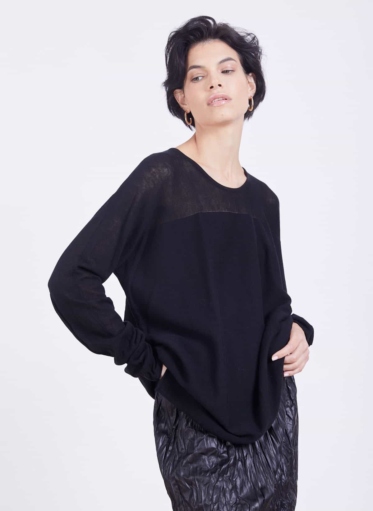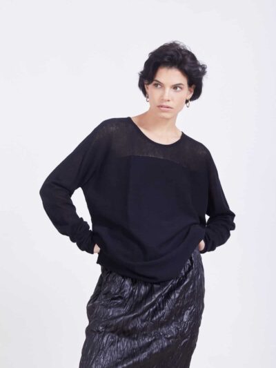 Liberty cotton fine knit top spiced with sheer knit effect along arms and shoulders.