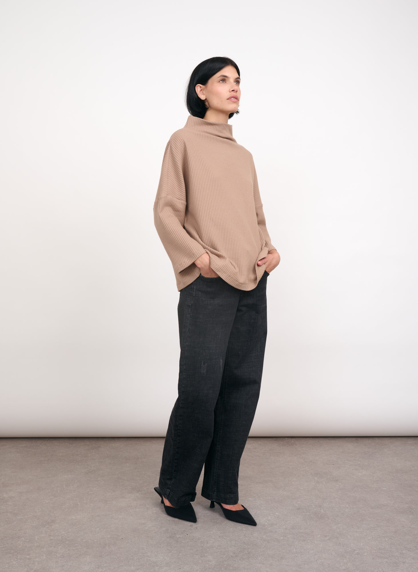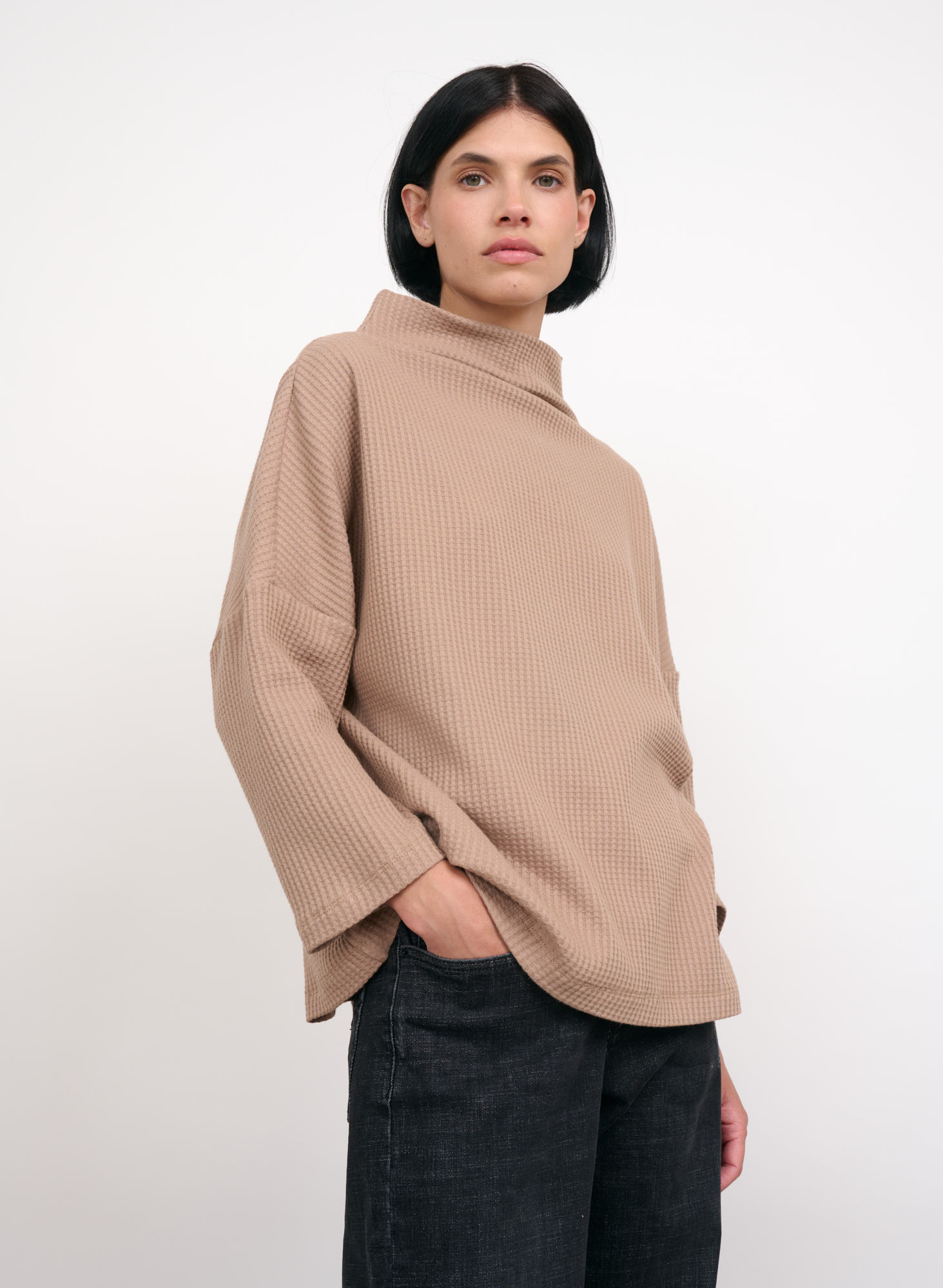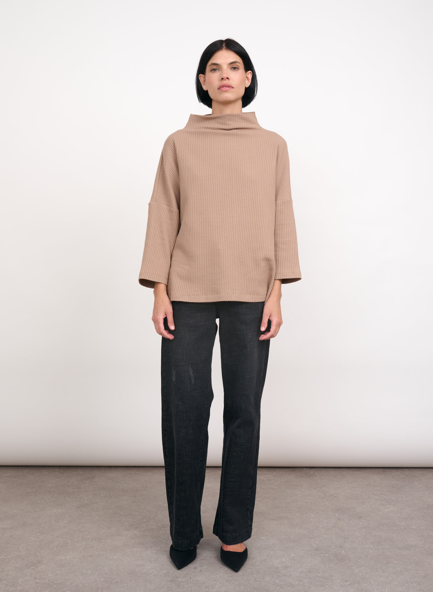 Sophie cotton jersey waffle top with high collar.